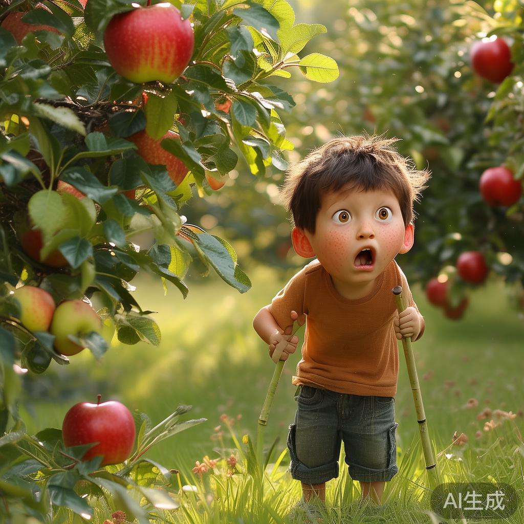 可就在这个时候,肚子开始抗议,那种饿得发慌的感觉袭来。他很想吃苹果,以前每次都是拼命攀爬到树上去摘,但每次都会“砰”的一声摔下来,像棵大白菜那样。“妈呀,”他的脑海里灵光一现,“要不干脆用根竹竿把它们钩下来?太聪明了吧!”
