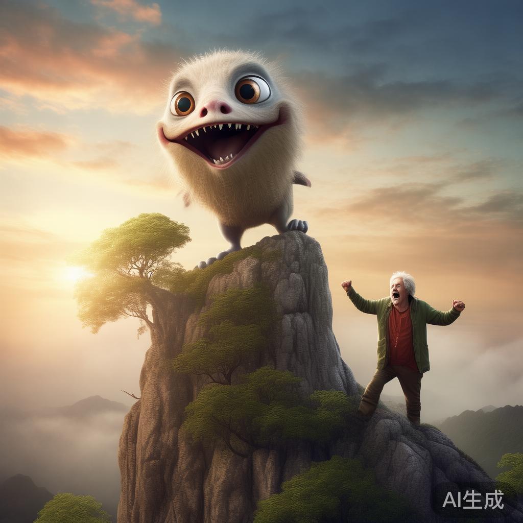 大头怪兽今天又来到了那棵高耸入云的大树上,像只刚学会飞的小鸟一样兴奋。他特别喜欢听那些爬山的人讲故事。这天,一个老爷爷首先气喘吁吁地爬上了山顶,他一边张开双手,一边大声喊:“我成功了!”