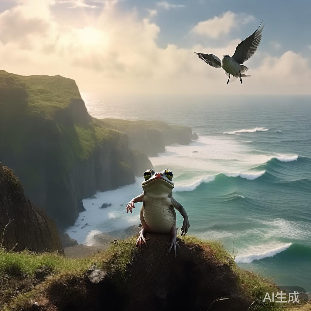 日复一日,时间悄然而逝。终究,他们踏完了所有的石阶,小鸟的翅膀终于痊愈,恢复了往日的灵动。随着一阵轻盈的振翅声,小鸟展翅飞起,穿越云霭,直冲蓝天。而站在山巅的青蛙,则目睹了一场视觉盛宴:它所期待的那片浩瀚大海。这时,大海在阳光下闪耀着银白色的光晕,波浪一次次扑打向岸边,仿佛在倾诉着千古不变的秘密。青蛙的心瞬间燃起热血,感受到的不只是风吹拂脸庞的凉意,而是真切体验到了自由与未知的魅力。